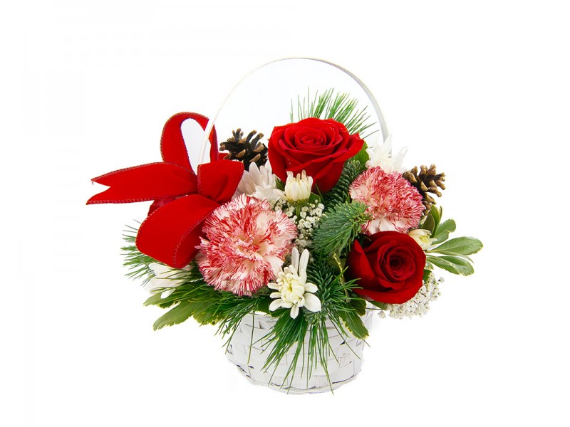 An adorable holiday basket filled with fresh red and white flowers. A perfect perk up for anyone needing some holiday spirit added to their day!