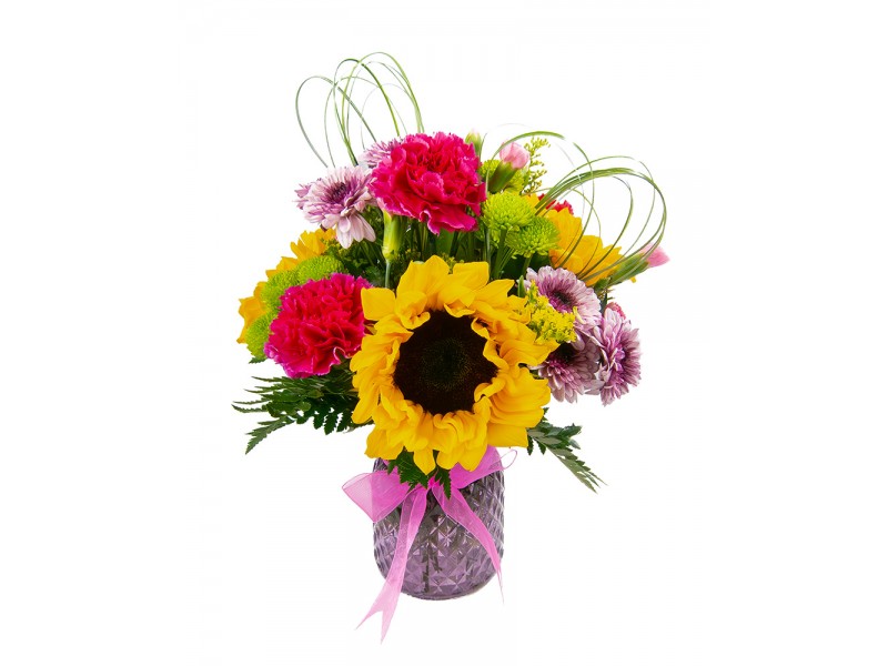 Featuring sunflowers, blue cushions, pink carnations, and green buttons styled in a purple diamond cut vase.
