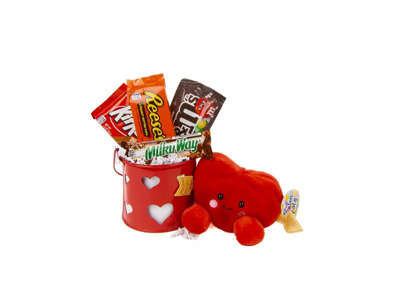 | Items in Product: | Nestled in a red tin with hearts - Plain M&Ms, Reese's, Milky Way, and Kit Kat with a Red Cupid's Heart Palm Pal |