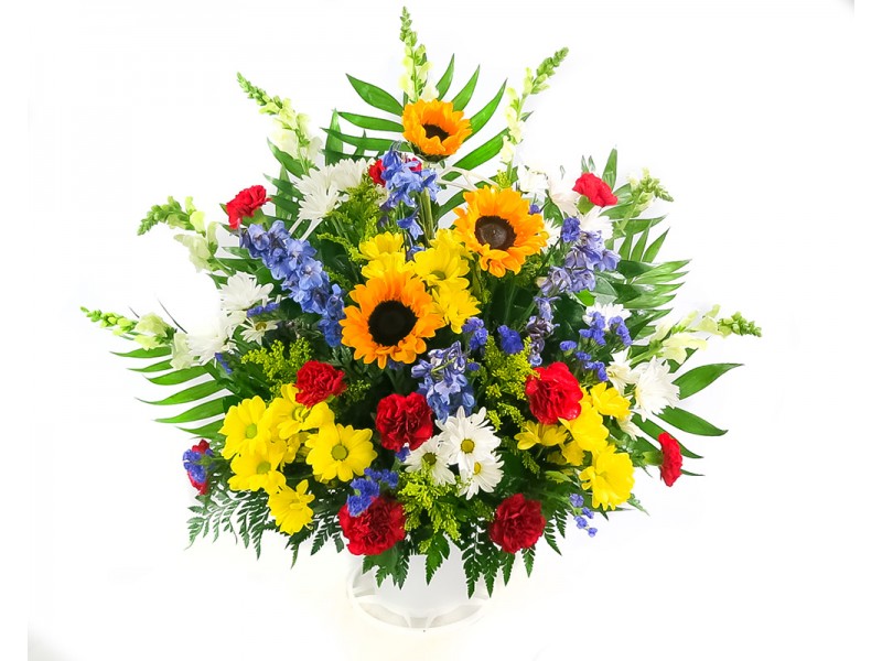Sunflowers, blue delphinium, white snapdragon, yellow and white dasies, red carnations, golden solidago, purple status, and greenery all in an Upright White Sympathy Basket