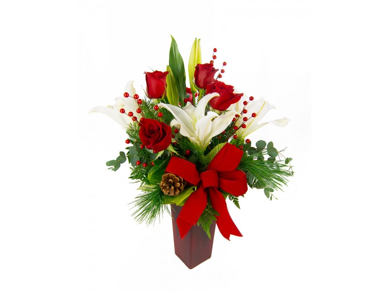 Experience the magic of the season with our Holiday Bliss floral arrangement, a stunning blend of festive beauty and timeless elegance. Featuring a harmonious mix of red and white blooms—such as velvety roses, white lilies, and fragrant evergreen accents—this arrangement exudes holiday charm.