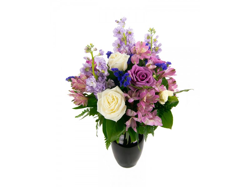 Celebrate the beauty of love with our Devoted Love Floral Arrangement. This exquisite display features a harmonious blend of purple and white stock, pristine white roses, and lush assorted greenery. Each bloom is carefully selected and artfully arranged in a deep purple vase, creating a striking contrast that enhances the beauty of the flowers. Perfect for any occasion, this elegant arrangement brings a sense of tranquility and grace to your home or office.